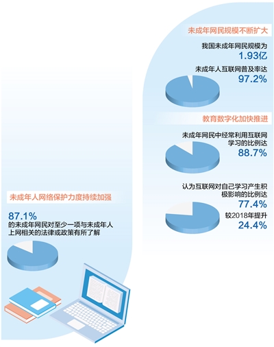 我国教育数字化加快推进,越来越多的未成年人积极拥抱数字化、信息化、智能化的学习方式,更加广泛、自主地利用互联网开展学习活动。报告显示,未成年网民中经常利用互联网进行学习的比例达88.7%;认为互联网对自己学习产生积极影响的比例,从2018年的53%提升到2022年的77.4%。